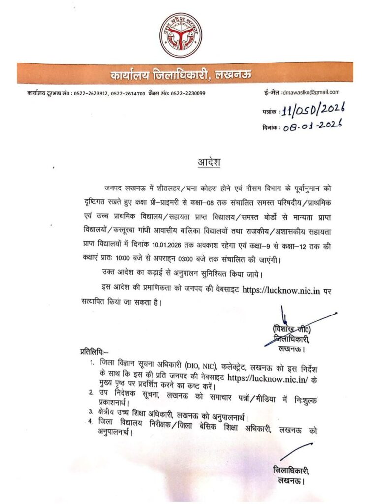 Lucknow schools will remain closed until January 10, 2026, as the city continues to experience a severe cold wave and dense fog, the District Magistrate has announced. Earlier, schools were scheduled to reopen on January 8, but the new order extends the closure for a few more days. The directive applies to all council schools, primary and upper primary schools, aided schools, schools recognized by all boards, Kasturba Gandhi Residential Girls Schools, and other government and non-government aided schools running from pre-primary to class 8.
