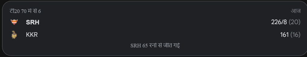 - SRH की पारी: हैदराबाद के सलामी बल्लेबाजों ने तेज शुरुआत की है। पहले 6 ओवरों में टीम ने बड़े स्कोर की नींव रख दी है।